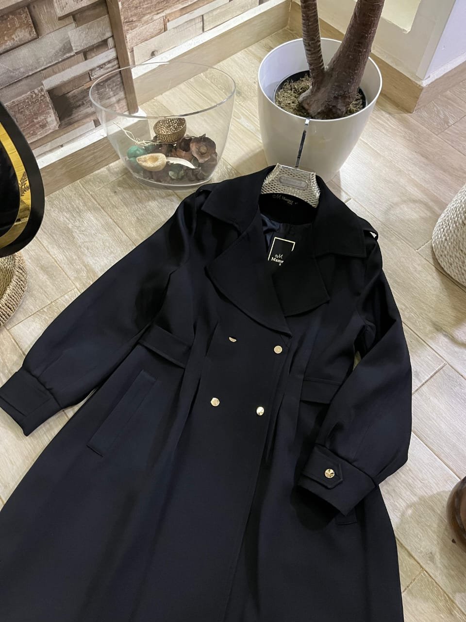 التصميم: معطف طويل (Trench Coat) بياقة عريضة كلاسيكية وتصميم "Double-breasted" بصفين من الأزرار الذهبية التي تضفي لمسة من البريق.
