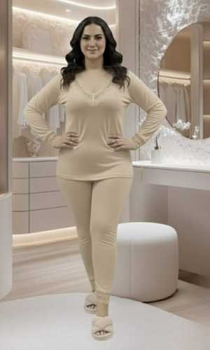 ستمتعي بليلة هادئة وأناقة لا تضاهى مع طقم "أورورا" المصمم خصيصاً لمن تقدّر التفاصيل الناعمة. يجمع هذا الطقم بين الراحة الفائقة واللمسات الأنثوية الراقية. التصميم: بلوزة بأكمام طويلة تتميز بفتحة رقبة على شكل حرف V مزينة بكنار عريض من الدانتيل الأبيض الفاخر، مع لمسات دانتيل مماثلة على أساور الأكمام ونهاية البنطال. الخامة: مصنوع من قطن ليكرا ناعم وعالي الجودة، لطيف على البشرة ويوفر مرونة تامة في الحركة. المقاس: متوفر بمقاس موحد (Taille Standard) يناسب مختلف الأجسام بفضل مرونة القماش.