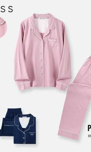 التصميم: طقم بيجامة مودرن يتكون من قميص بأكمام طويلة وياقة مطوية (Lapel Collar) على شكل حرف V، مع بنطال متناسق. الخامة: نسيج Brushed Elastane عالي الجودة يوفر الدفء والنعومة الفائقة للبشرة. التفاصيل: تتميز الياقة وأساور الأكمام بنقشة الـ "بولكا دوت" (النقاط البيضاء) التي تضفي لمسة عصرية وراقية. المقاسات: متوفر بمقاسات واسعة من M إلى XXXL. الألوان: متوفر باللون الكحلي الملكي والوردي الداكن (Rose).