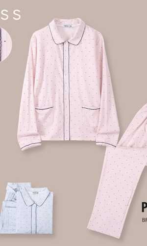 التصميم: طقم بيجامة مودرن يتكون من قميص بأكمام طويلة وياقة مطوية (Lapel Collar) على شكل حرف V، مع بنطال متناسق. الخامة: نسيج Brushed Elastane عالي الجودة يوفر الدفء والنعومة الفائقة للبشرة. التفاصيل: تتميز الياقة وأساور الأكمام بنقشة الـ "بولكا دوت" (النقاط البيضاء) التي تضفي لمسة عصرية وراقية. المقاسات: متوفر بمقاسات واسعة من M إلى XXXL. الألوان: متوفر باللون الكحلي الملكي والوردي الداكن (Rose).